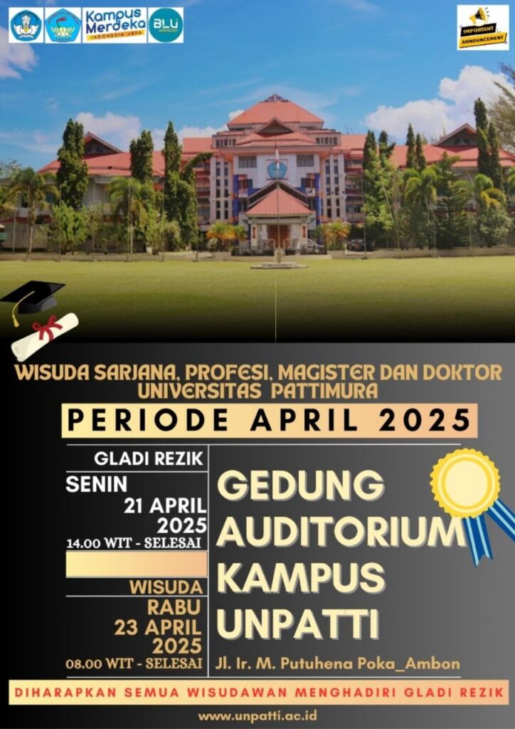 Wisuda Periode April Tahun Akademik 2024/2025 Genap Date: Wednesday, 23 April 2025Time: 08:00 - Location: Auditorium Universitas Pattimura Facebook Twitter WhatsApp Pinterest