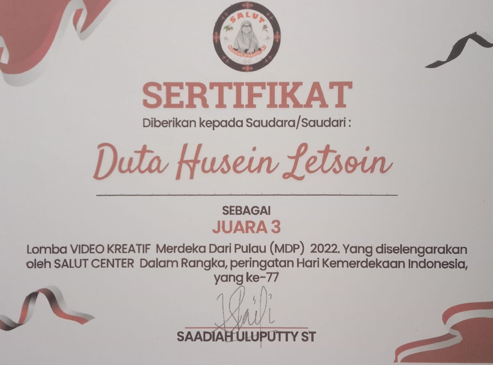 Datu Husen Letsoin – Juara III Lomba VIDEO KREATIF Merdeka Dari Pulau (MDP) 2022 EPApril 8, 2026 Facebook Twitter WhatsApp Pinterest
