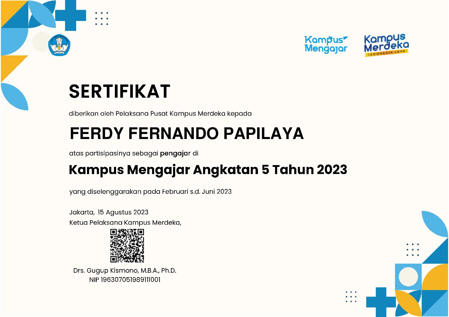 FERDY FERNANDO PAPILAYA – Sebagai Pengajar di Kampus Mengajar Angkatan 5 Tahun 2023 EPApril 8, 2026 Facebook Twitter WhatsApp Pinterest